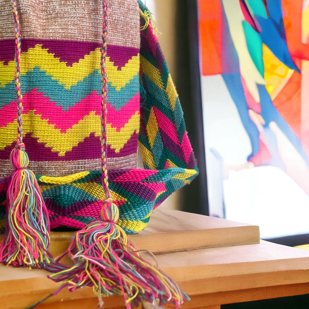 Destaca la autenticidad y la artesanía única de las mochilas Wayuu. Cada pieza es tejida a mano por artesanos indígenas, lo que aporta un toque especial y exclusivo a cada mochila